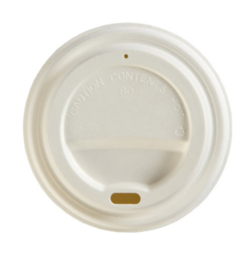 Large Compostable Bagasse Lids for 90mm rim diameter hot drink paper cups. Lids are tight fitting, home compostable and plastic free.